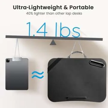 Show moreElevate your workspace experience with the HUANUO Laptop Lap Desk, the ultimate companion for productivity on the go. Designed to fit laptops and tablets up to 15.6 inches, this lightweight lap desk weighs just 1.4 lbs and is equipped with a comfortable carry handle, making it ideal for transport between the office, school, or even while you're on the road. Crafted with a premium PU leather surface, it not only showcases a sleek design but also provides a smooth and easy-to-clean platform for your devices. Its spacious dimensions of 16.9" x 12.6" ensure you have enough space to work effectively and comfortably, whether on your sofa or in bed.