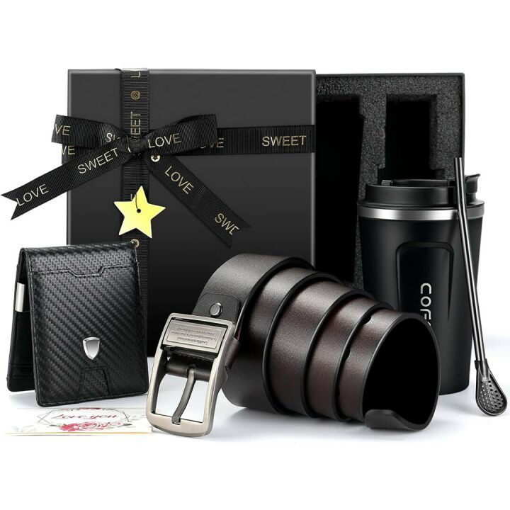 What sets this gift box apart from others is its blend of practicality and quality. The coffee travel mug keeps beverages hot for hours, making it perfect for work commutes. The belt, crafted with high-quality genuine leather, ensures durability and a perfect fit. The men's wallet, made from vegan leather, offers multiple card slots and a cash clip, making it both stylish and functional. All these items come in a beautifully designed gift box that adds an extra touch of elegance and convenience, as it requires no additional wrapping.