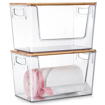 Show moreRevitalize your home organization with the **Hudgan 2 Set Stackable Storage Trash Bag Holder Dispenser**. Perfectly designed for homes that demand functionality without sacrificing aesthetics, these innovative storage bins feature a tastefully crafted bamboo top measuring 12" x 7" x 0.35" thick. The bins themselves are spacious, measuring 12" x 7" x 7" high, allowing you to store various household items with ease. Their open-front design ensures that you can quickly grab whatever you need without having to remove the lid, streamlining your kitchen routine and enhancing convenience.
