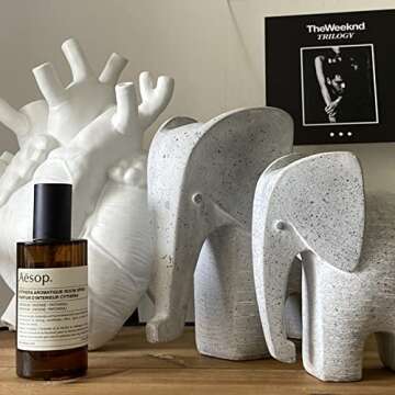 Show moreIntroducing the Huey House Elephant Sculptures – a charming and elegant duo of handcrafted figurines designed to enhance your home decor. Specifically crafted to symbolize luck and prosperity, these delightful elephants are perfect for adding a touch of whimsy and elegance to any space in your home. With one elephant standing at 6 inches tall and the other at 5 inches, this set provides versatile decor options to adorn your bookcases, kitchen shelves, or any nook that craves a hint of charm. Made with meticulous attention to detail, their light gray, cement-like finish offers a perfect balance of modernity and timeless appeal, ensuring they complement diverse design aesthetics, from boho chic to industrial flair.