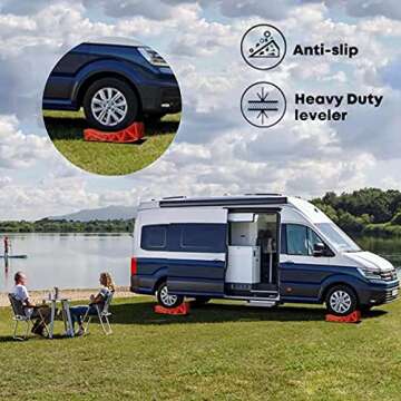 Our top-tier **non-slip mats** enhance friction to prevent any sliding when you drive your camper onto the levelers. Additionally, they keep the chocks firmly in place, ensuring that your setup remains stable. The whole assembly is designed for ease of use; you can level your camper in just **5 minutes**! Simply place the mats and levelers, drive your camper onto them, and secure with the chocks.