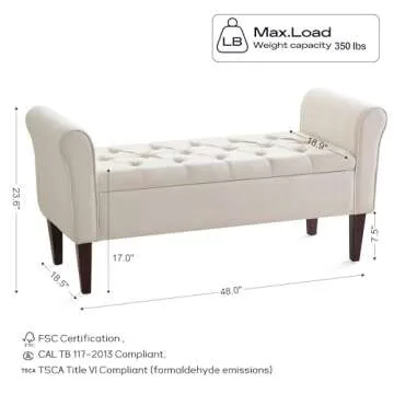 Show more Introducing the HUIMO 48" Arm Storage Ottoman – a perfect blend of style and utility for your home. This elegant storage bench boasts a classic beige upholstery that elevates any room's decor. Constructed with high-quality resilient foam and luxurious polyester fabric, it provides the ideal balance between softness and firmness, ensuring that your comfort is prioritized. With its simple yet sophisticated rolled arms, this ottoman doubles as a chic little sofa, making it a versatile addition to your living space.