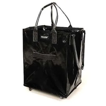 HULKEN - (Medium, Shiny Black Reusable Grocery Bag On Wheels, Shopping Trolley, Rolling Tote, With Zipper Closure, Folds Flat, Unbreakable Handles, Lightweight and carries Up To 66 lb