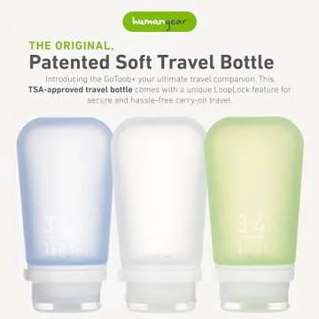 Show more The Original Soft Travel Bottle - humangear's patented GoToob+ is the ultimate solution for all your travel needs. This uniquely designed travel bottle is perfect for various adventures, whether you're heading off for a day trip to the beach, an overnight camping excursion, or leaping onto a flight across the country. With a capacity of 3.4 fl. oz., it is conveniently TSA-approved, allowing you to bring your favorite liquids on board without a hassle.