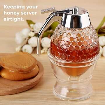 Hunnibi Glass Honey Dispenser - Clear - No Drip, with Stand, Stainless Steel TOP - Honey Pot, Honey Jar, Syrup Dispenser