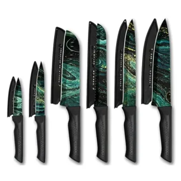 Show moreIntroducing the exquisite 12-piece knife set, a culinary essential that combines functionality with artistry, designed for both novice cooks and seasoned chefs. This set includes an impressive assortment of knives: an 8-inch chef's knife, perfect for chopping and slicing; an 8-inch slicing knife for precision cuts; a 7-inch santoku knife, renowned for its versatility; an 8-inch serrated bread knife, ideal for tearing through crusts with ease; a 5-inch utility knife for all-around cutting tasks; and a 3.5-inch paring knife, perfect for intricate peeling and slicing. Additionally, it comes with six protective blade guards to ensure safe storage and prolong the life of the knives. The brilliance of this knife set lies not just in its variety, but in the craftsmanship of each piece, ensuring they meet all your culinary needs.