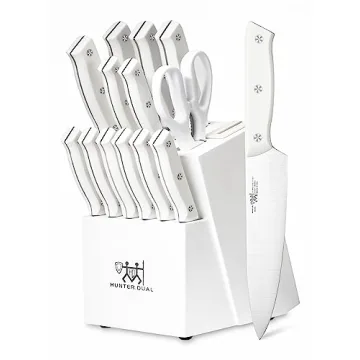 HUNTER.DUAL Knife Set, 15 Piece Kitchen Knife Set with Block Self Sharpening, Dishwasher Safe, Anti-slip Handle, White