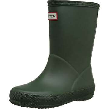 Show moreStep out in style and comfort with the HUNTER Kids Unisex First Classic Rain Boots in a gorgeous Hunter Green. Perfectly designed for toddlers and little kids, these boots ensure that even the youngest adventurers can splash through puddles and enjoy rainy days without a second thought. Crafted with high-quality materials, these boots feature a durable rubber exterior that not only protects tiny toes from moisture but also provides excellent grip for slippery surfaces. The recognizable HUNTER design makes them visually appealing while delivering unmatched functionality.