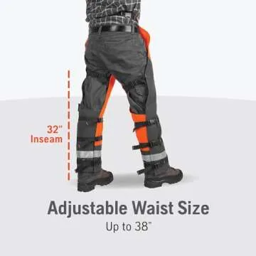 Show moreExperience unparalleled protection and comfort with the Husqvarna Technical Apron Wrap Chainsaw Chaps. Specially designed for professionals and avid gardeners alike, these chaps offer both style and safety. Made from durable 1000 Denier polyester with a PVC coating, they are constructed to withstand the rigors of heavy-duty use. With an adjustable waist size of up to 38 inches, these chaps ensure a perfect fit for every user, providing maximum coverage from waist to ankle in a vibrant orange color that enhances visibility in any environment.
