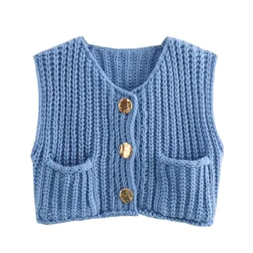Hvewarm Womens Casual Chunky Knit Vest Gold Button Down Crop Crochet Sleeveless Sweater Vest (Blue-M)