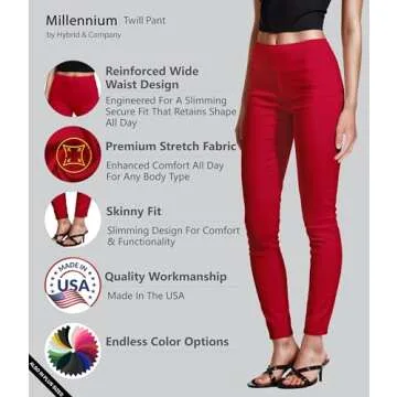 Show moreDiscover ultimate comfort and style with the Hybrid & Company Super Comfy Stretch with Full Elastic Waist Pull On Millennium Twill Pant in a stunning red hue, perfectly tailored for the modern woman. These pants are crafted from a state-of-the-art ultra-stretch material that ensures a snug yet flexible fit, accommodating every movement throughout your day without feeling constricted. The full elastic waistband is designed not just for ease, but also to provide a flawless silhouette that flatters your figure. Gone are the days of compromising comfort for style—these pants effortlessly blend both, making them a go-to piece in any wardrobe.