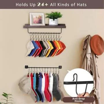 HYDERMUS Hat Rack for Wall with Shelf for 24 Baseball Caps Metal Hat Organizer with 12 Clips and 12 Hook Hat Holder Wall Mounted for Baseball Caps Trucker Hat and Others Hat Weathered Walnut