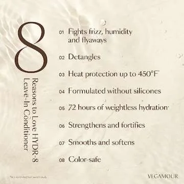 Show more Introducing the HYDR-8 Leave-In Conditioner & Heat Protectant Spray, your ultimate hair care solution crafted by VEGAMOUR. This innovative product stands out with its unique blend featuring a vegan alternative to keratin and silicone called Karmatin, designed to protect, strengthen, and repair the appearance of dry, damaged hair. Imagine experiencing a remarkable 14X hydration after just one use! Yes, you read that right! This hydrating leave-in conditioner does wonders by fighting frizz, humidity, and tangles while providing 72 hours of hydration, leaving you with instantly softer and more manageable hair.