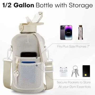 Show more Introducing the ultimate hydration solution for those on the go - our HYDRARANK Half Gallon Water Bottle with Storage Sleeve and Straw Lid! This remarkable product holds a generous 74 ounces of water, making it effortlessly simple to track and achieve your daily hydration goals with just one refill. Whether you’re busy at work, hitting the gym, or enjoying a day out, this water bottle ensures you have access to ample hydration without constant stops. Designed with a sleek, neutral tone and stylish accents of gold, it complements any outfit and is a perfect accessory for every occasion.