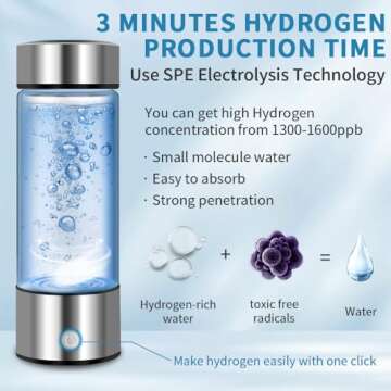 Show more The Hydrogen Water Bottle is a revolutionary hydration accessory that unlocks the power of hydrogen-rich water, renowned for its potential to enhance health and wellness with each sip. Whether you're striving to boost your energy levels or to incorporate healthier habits into your daily routine, this innovative product is your perfect companion. With advanced electrolysis technology, this bottle efficiently infuses water with hydrogen gas, thereby producing high-quality hydrogen water in mere three minutes. Packed with antioxidants, hydrogen-rich water can help reduce oxidative stress in the body, promote metabolism, and enhance nutrient absorption.