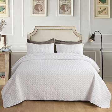 Hygge Hush Summer Quilt Set, Full Queen Size Pure White Leaves Pattern 3 Pieces Oversized Modern Style Bedspread for All Season (1 Quilt & 2 Pillow Shams)