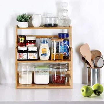 Show more This stunning multi-purpose shelf is expertly crafted with a beautiful design that brings elegance to any space it occupies. Made from high-quality bamboo material, it is not only visually appealing but also free of harmful chemicals, ensuring the safety of your goods. Its versatility allows it to serve multiple purposes throughout your home. Use it in the kitchen to organize spices and condiments, in the bathroom for lotions and toiletries, or as a decorative piece for books and plants in your study. The unique design allows for a variety of items, both big and small, to be stored and displayed with ease.