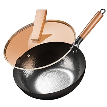 Show more Introducing the Hyoank AsianTraditional Wok Pan, a magnificent kitchen masterpiece designed for both aspiring and seasoned chefs. This 12.4-inch wok is expertly crafted from high-quality carbon steel, ensuring it is durable and healthy for all your culinary adventures. Unlike traditional non-stick pans, this wok offers a natural cooking surface that enhances the flavor of your dishes while retaining essential nutrients, especially in vegetables. With its standable glass lid, you can effortlessly monitor your meals as they cook, bringing a new level of convenience to your kitchen. The sleek, detachable wooden handle ensures that you can use the wok safely and store it easily, making it an invaluable addition to your cookware collection. Whether you are stir-frying, steaming, or even baking, this wok is designed to perform admirably, making it the perfect tool for a variety of cuisines.