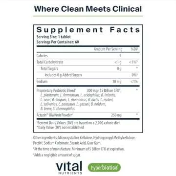Show more Experience digestive wellness like never before with Hyperbiotics Vital Nutrients Pro-15 Advanced Probiotics, meticulously formulated for both men and women. This once-daily probiotic is powered by a dynamic blend of 15 diverse, research-backed probiotic strains, including essential Lactobacillus and Bifidobacterium strains, accompanied by the unique addition of clinically studied kiwifruit. This powerful combination supports not only regularity and frequency of bowel movements but also comforts against common digestive discomforts such as gas and bloating. Say goodbye to feeling sluggish, and embrace every day with vitality!