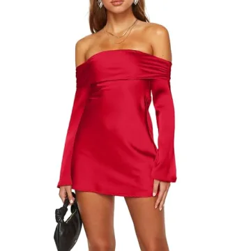 HYPERFIRE Women's Elegant Satin Off The Shoulder Long Sleeve Mini Dress Tie Back Wedding Cocktail Dresses Red Large