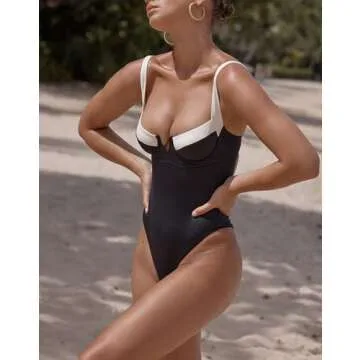HYPERFIRE Women's High Cut Cheeky One Piece Swimsuit Underweired Swimwear Push up Bathing Suit Black and White Medium