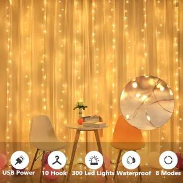 Show more The stunning LED Curtain Lights from a trusted brand elevate any space with their enchanting glow. Designed to bring a warm and inviting ambiance, these lights feature 8 unique lighting modes including combination, in waves, sequential, slow fade, and twinkle which allow you to customize your atmosphere for any occasion. Measuring 9.8 ft x 9.8 ft, they're perfect for transforming your bedroom, living room, or even an outdoor garden into a mesmerizing wonderland.