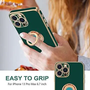 Show more This exquisite phone case is expertly designed for the iPhone 13 Pro Max 6.7 inch, catering specifically to those who understand the importance of both style and functionality. With its rich and vibrant colors, the case is more than just a protective accessory; it's a statement piece that exudes luxury and sophistication. The standout feature of this case is its 360-degree rotatable ring kickstand, which not only serves as a convenient way to prop up your phone for hands-free viewing but also provides a secure grip, ensuring you never drop your device.