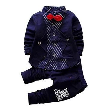 Show moreThe Long Sleeve Shirt and Pants Set with Matching Detachable Bow Ties is a stylish ensemble designed specifically for newborns and infants. Produced by a brand that values quality and fashion, this outfit stands out with its charming tuxedo design that combines elegance with practicality. The unique feature of this set lies in the one-piece design of the jacket and shirt, allowing for easy coordination without the hassle of mismatched clothing. Crafted from a soft cotton blend, this sweatsuit guarantees a gentle touch against delicate baby skin, making it perfect for all-day wear.