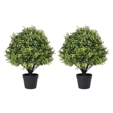 Show moreTransform your outdoor and indoor spaces with the I.C.ELAINE 24" Faux Boxwood Plants Outdoor. This meticulously designed set of two artificial topiary trees stands approximately 27 inches tall and 19 inches wide, creating a striking visual impact wherever placed. Coming pre-potted in a sleek black plastic pot (6.3''W x 5.1''H), these faux plants are ready to enhance your surroundings directly out of the box. Ideal for a variety of settings, you’re looking to enhance your front porch, patio decor, or even your living room; these artificial shrubs can also be easily installed in the ground or in decorative planters for added authenticity.