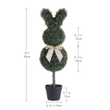 Show more Transform your space with the I.C.ELAINE 36" Bunny-Shaped Rabbit Topiary Trees, a charming 2-pack addition designed to bring whimsical delight to your front porch or garden. Standing at a delightful 36 inches high and 11 inches wide, these artificial topiary trees are masterfully crafted to resemble cute rabbits complete with fluffy ears and an adorable bow tie. Made from soft green boxwood leaves, they convey a playful and lifelike aesthetic, providing a breath of fresh spring energy to your decor. Ideal for Easter celebrations or year-round enjoyment, these topiaries make your outdoor area both inviting and vibrant.