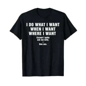Introducing the perfect combination of humor and comfort, the 'I Do What I Want When I Want Where I Want Except I Gotta Ask My Wife' T-shirt is tailored for the fun-loving husband who appreciates a witty expression of his personality. This shirt not only delivers a playful message but is also crafted with exceptional quality, ensuring that your husband can showcase his unique style while enjoying unmatched comfort. Produced by a reputable brand well-known for quality men's apparel, this T-shirt...