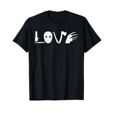Unleash your inner horror aficionado with the most striking homage to scary films! This unique product features the vibrant phrase 'Horror movie love' artfully spelled out using cutting-edge weapon motifs that scream Halloween thrills and chills. Whether you're cozying up with a classic slasher or binging on the latest supernatural hits, this shirt is more than just apparel—it's a badge of horror appreciation. Crafted by a brand that understands the nuances of genre fandom, the design emphasizes...