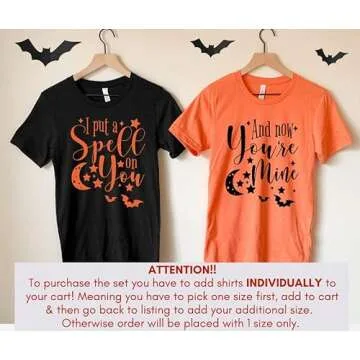 Show moreTransform your Halloween celebration with the enchanting "I Put A Spell On You" His and Her Halloween Couple Outfits. These matching Halloween shirts are not just your average t-shirts; they are an expression of your playful love and togetherness. Crafted from high-quality, breathable cotton, these shirts ensure both comfort and style as you partake in spooky festivities. Each shirt features vibrant, eye-catching designs that make a bold statement at any Halloween party. Whether you're trick-or-treating or attending a themed event, these shirts will have you both looking fabulous and festive!