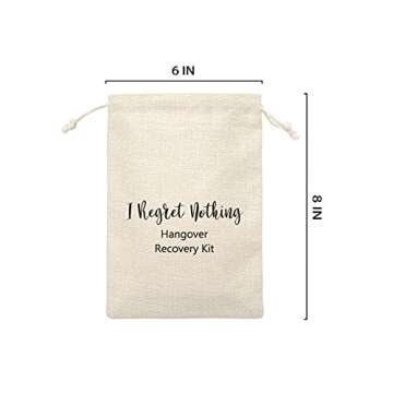 Show moreIntroducing the **I Regret Nothing Hangover Recovery Kit Gift Bags**! This delightful set of five pouches is the ultimate blend of functionality and fun, designed specifically to help those who *might have overindulged* at a party or wedding. Made with high-quality materials, these drawstring bags are not just practical, but they make for an entertaining party favor that will have your guests laughing long after the festivities are over. Perfect for any *celebration*, they add a unique touch to your event whilst helping your loved ones bounce back swiftly from a night of revelry.