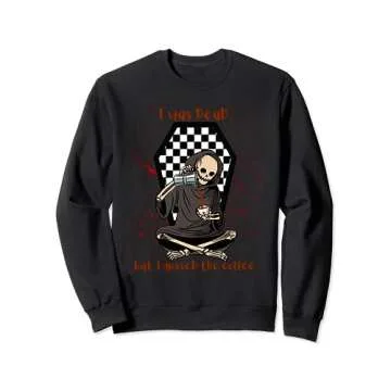 Show moreStep into the spirit of the spooky season with our "I Was Dead, But I Missed the Coffee" Sweatshirt. This delightfully humorous apparel is perfect for anyone who loves to celebrate Halloween with a twist. Featuring a playful design, the sweatshirt showcases a charming skeleton savoring a cup of coffee, set against the backdrop of a checkered coffin. It's the ideal way to show off your love for ghoulish antics while keeping cozy.