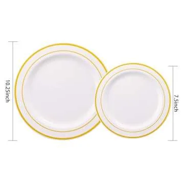 Show more Introducing our exquisite I00000 102 Pieces Gold Plastic Plates, the perfect combination of elegance and practicality. Crafted from 100% food-grade plastic, these plates feature a beautiful white base adorned with an elegant gold rim, bringing a touch of sophistication to any event. Say goodbye to the hassle of post-party cleanup while enjoying the class of fine china. These plates are completely BPA-free and free from harmful toxins, ensuring safety for you and your guests with every bite. Whether you’re serving a lavish dinner or an intimate gathering, these versatile plates elevate your dining experience effortlessly.