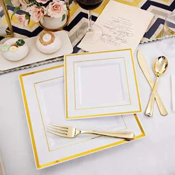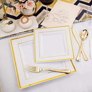 I00000 150PCS Gold plastic dinnerware set,White Gold Square Plates, Disposable Square Gold Plates Includes 25 Dinner Plates 25Dessert Plates 25Cups 25Plastic Cutlery for Christmas Party