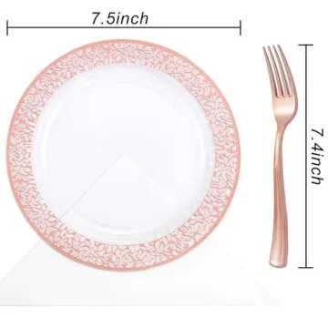 Introducing the stunning 72 Pcs Rose Gold Dessert Plates and 72 Pcs Disposable Forks, where elegance meets functionality. These exquisite plates and forks, measuring 7.5 inches and 7.4 inches respectively, feature a beautiful lace design that captures attention at every gathering. Made from 100% food-grade plastic, our dinnerware ensures a safe dining experience while offering the chic appeal of traditional tableware without the risk of breakage....