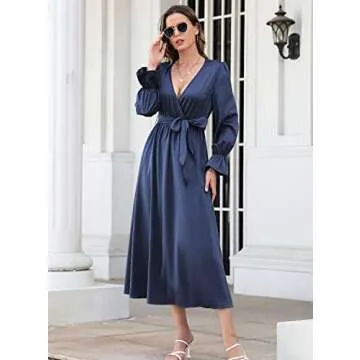 Show more Step into elegance with the I2CRAZY Cocktail Dresses for Women, a luxurious satin maxi dress designed to make a statement at any occasion. Made from 100% Polyester, this stunning long sleeve dress is not just a fashion item; it is a versatile garment that transitions beautifully through all seasons - spring, summer, fall, and winter. Its unique V neck wrap design showcases your neckline while the flounce sleeves add a touch of drama. Perfectly tailored with a high waist and a flattering belt, this dress accentuates your curves and provides a comfortable fit, allowing you to feel both confident and stylish.