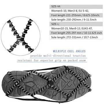 Show more The ultimate solution for icy conditions, these premium Traction Cleats offer reliability and safety for anyone venturing outdoors during winter months. Constructed with 1.2 mm steel coils, they provide unparalleled multi-directional traction, ensuring a firm grip on packed snow and ice. Whether you're ice fishing, hiking, or simply taking a walk in frigid temperatures, these cleats effectively reduce the risk of slips and falls, making it safer for users of all ages and both sexes.
