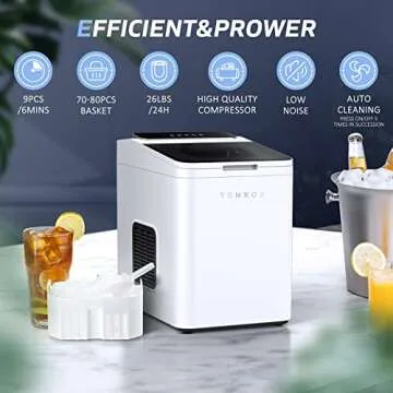 Show more The TENXOE Portable Ice Maker is your ultimate companion for refreshing moments at home, in the office, or during a party. With its sleek, compact design, this countertop ice maker churns out an impressive 26 pounds of ice in just 24 hours, ensuring that you never run out of ice when you need it most. In as little as 8 minutes, you can enjoy 9 delicious bullet ice cubes, perfect for cooling your beverages, enhancing cocktails, or serving icy treats. Its user-friendly interface makes operation a breeze, while the self-cleaning feature guarantees hassle-free maintenance—just turn it on, and it does the rest for you.
