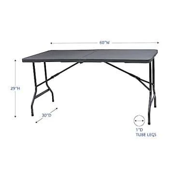 Show moreIntroducing the Iceberg IndestrucTable Too Bi-Fold Folding Table, your ideal solution for a versatile and space-efficient furniture piece that seamlessly integrates into both your indoor and outdoor settings. Crafted with durability in mind, this commercial-grade folding table boasts a dent and scratch-resistant surface with elegant soft beveled radius edges, finished in a sophisticated charcoal hue that enhances any decor. Whether you need a table for hosting gatherings, family game nights, or a workshop, this 60" wide by 30" long table provides ample room to accommodate your needs without compromising on style or functionality.