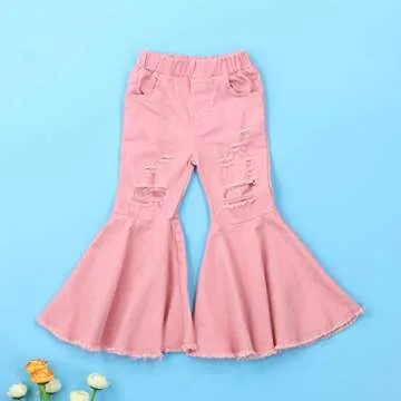 ICECTR Toddler Baby Girls Kid Flared Denim Pants Ruffled Wide Legs Ripped Jeans High Waist Bell Bottoms Casual Outfit (Pink, 1-2T)
