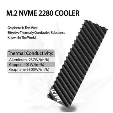 Show more Introducing the icepc M.2 Heatsink for PS5 PCI-E NVME 2280 SSD, an innovative cooling solution that harnesses the power of graphene coating and copper to provide unparalleled heat dissipation for your SSD. With an extraordinary thermal conductivity rate of 5300W/m·K, this heatsink outperforms traditional cooling methods such as pure copper at 386.4W/m·K and aluminum at 237.2W/m·K. This cutting-edge technology guarantees that your SSD operates at optimal temperatures, enhancing performance and prolonging its lifespan. Suitable for a range of models, including SN750, 850 EVO, 860 EVO, 960 EVO, and others, this heatsink is designed for 2280 size (22x80mm) M.2 NVME SSDs, ensuring broad compatibility.