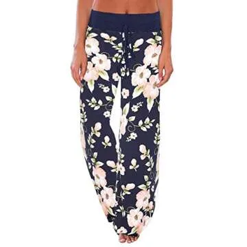iChunhua Women's Casual Floral Print High Waist Wide Leg Pants with Drawstring Navy Blue XL