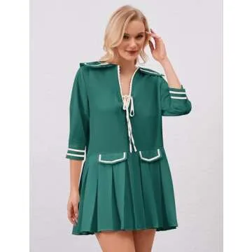ICOBID Women Cute Bow Tie Up Open Front Mini Dress Lapel Contrast Binding 3/4 Sleeve Mini Dress Pleated A line Dresses Green