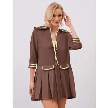 ICOBID Women Cute Bow Tie Up Open Front Mini Dress Lapel Contrast Binding 3/4 Sleeve Mini Dress Pleated A line Dresses Coffee