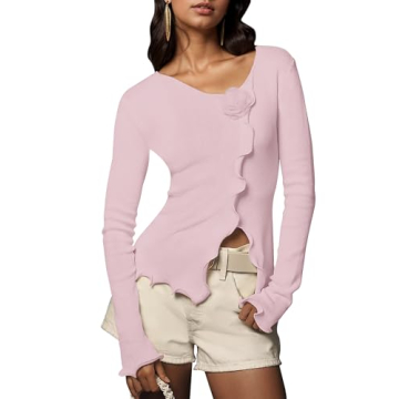 ICOBID Womens 3D Flower V Neck Ruffle Trim Shirt Y2k Long Sleeve Slit Hem Knit Tops Lightweight Slim Fitted Sweater