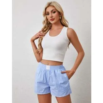 ICOBID Womens Lounge Shorts Striped Elastic Waist Pajama Shorts Summer Causal Boxers Bottoms Comfy Sleepwear With Pockets, Small, Blue&white