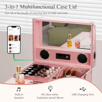 Icoget Portable Rolling Manicure Table for Nail Teach, Foldable Traveling Nail Desk w/Storage, Mobile Nail Table w/Audio and Mirror, Makeup Train Case Cosmetic Trolley, Pink